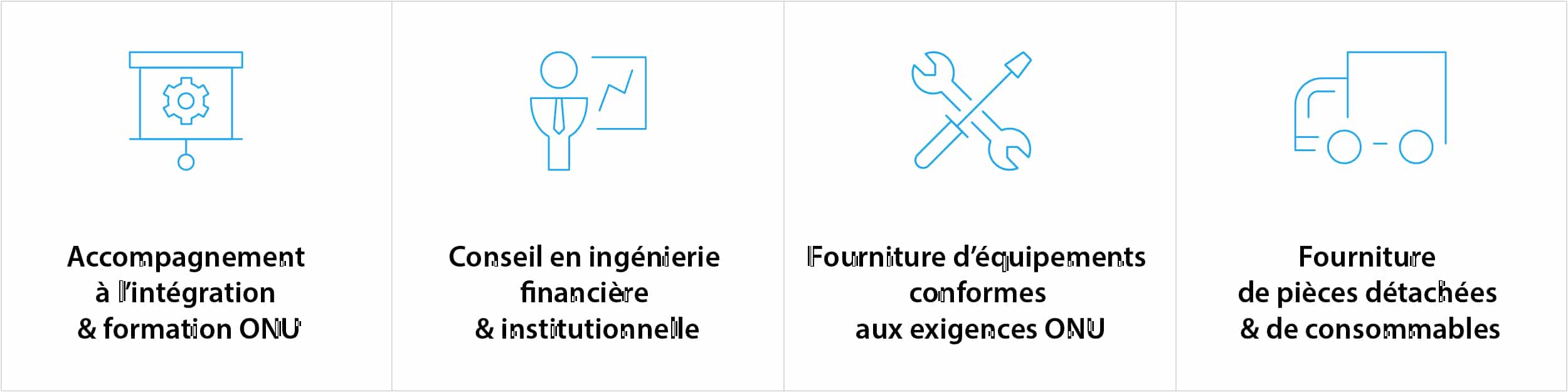 À travers l’offre globale et sur-mesure, OMP Solutions répond aux critères et aux besoins capacitaires requis par les Nations Unies dans un contexte financier équilibré.